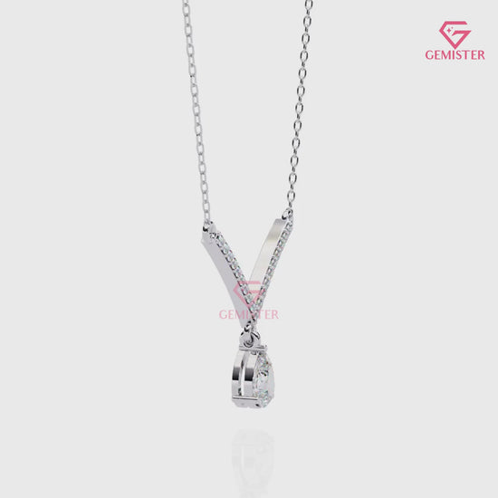 Make a graceful statement with this 0.48 CT Pear Cut Lab Grown Diamond V-Shaped Drop Necklace in 14K Yellow Gold. Featuring a dazzling pear-cut moissanite suspended from a sleek V-shaped bar accented with brilliant stones, this necklace exudes timeless elegance and modern sophistication.