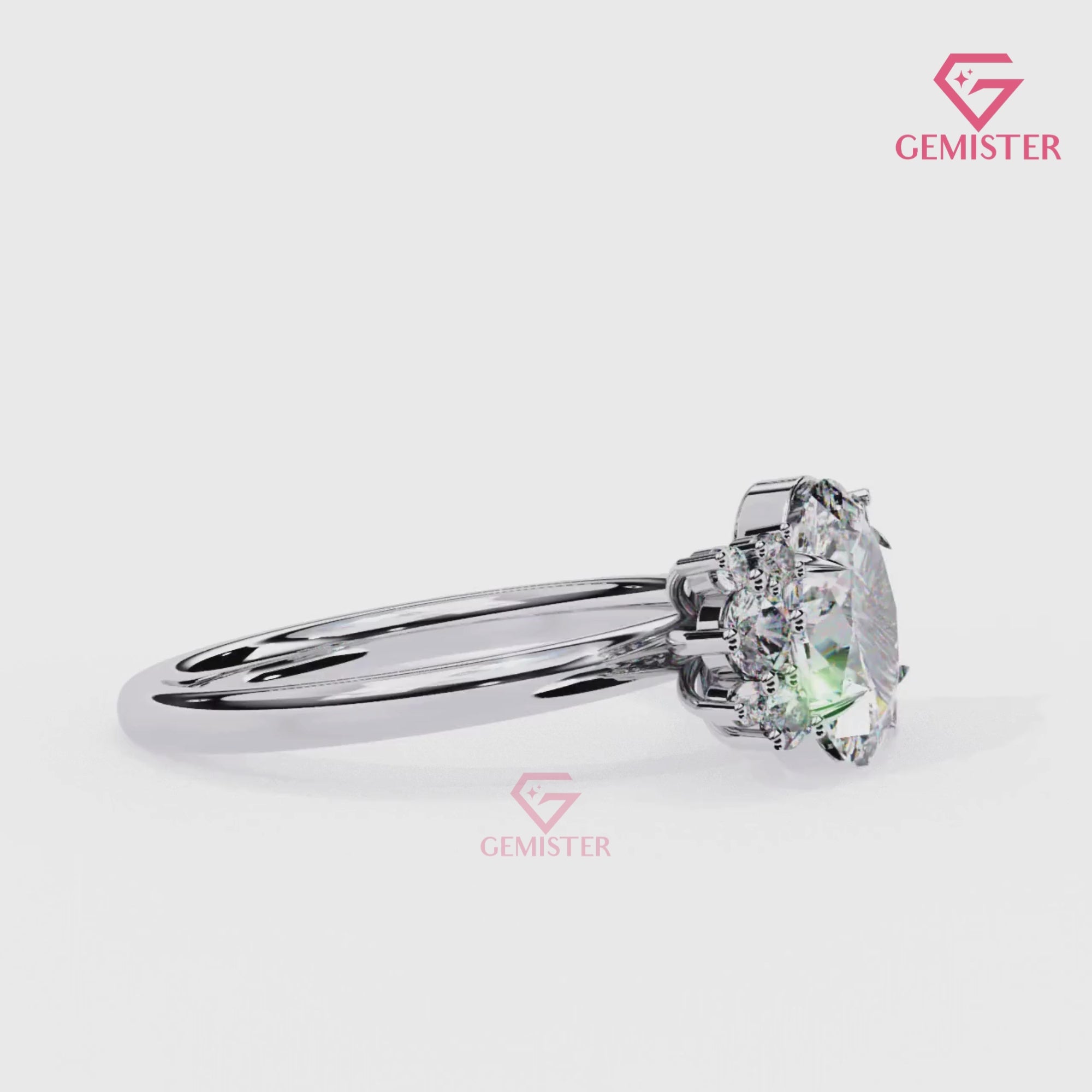 Framed by a stunning cluster of side diamonds, this design enhances the brilliance of the center stone while adding a unique and luxurious flair. The elegant arrangement creates a floral-inspired look, making this ring truly distinctive and eye-catching.