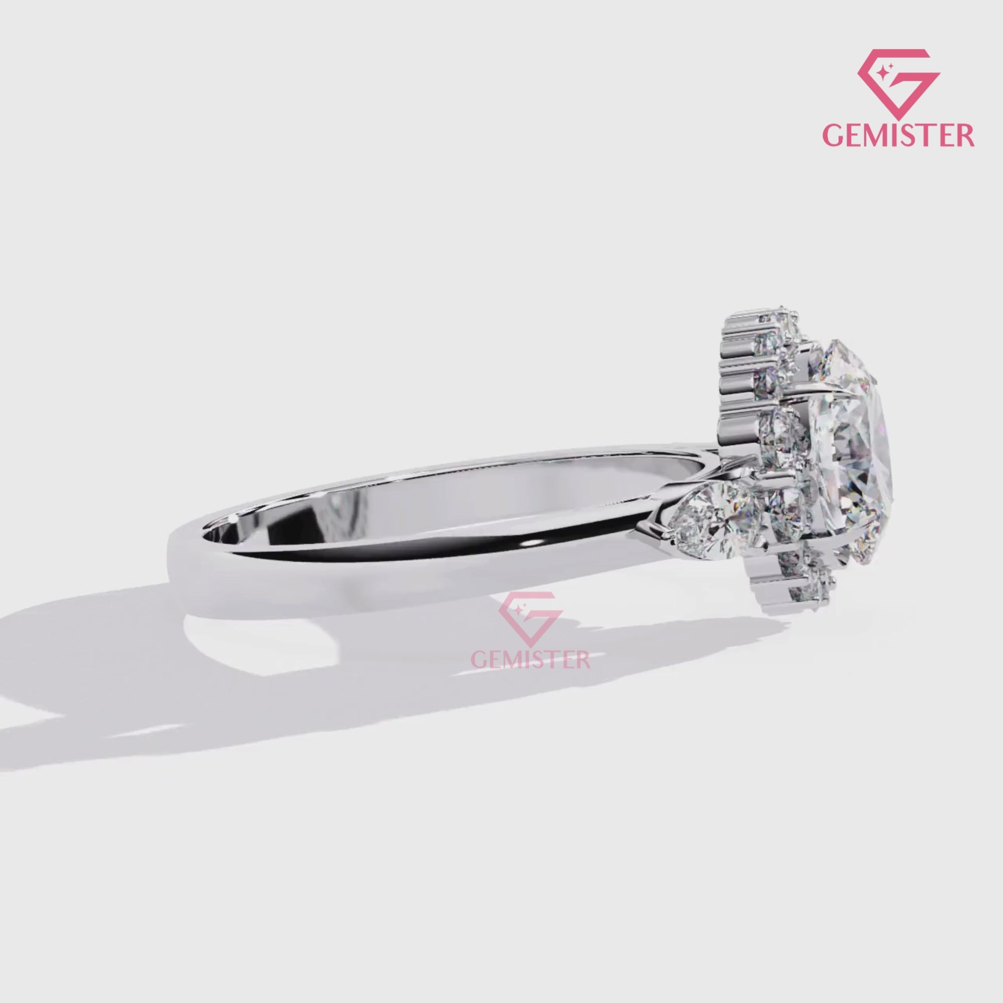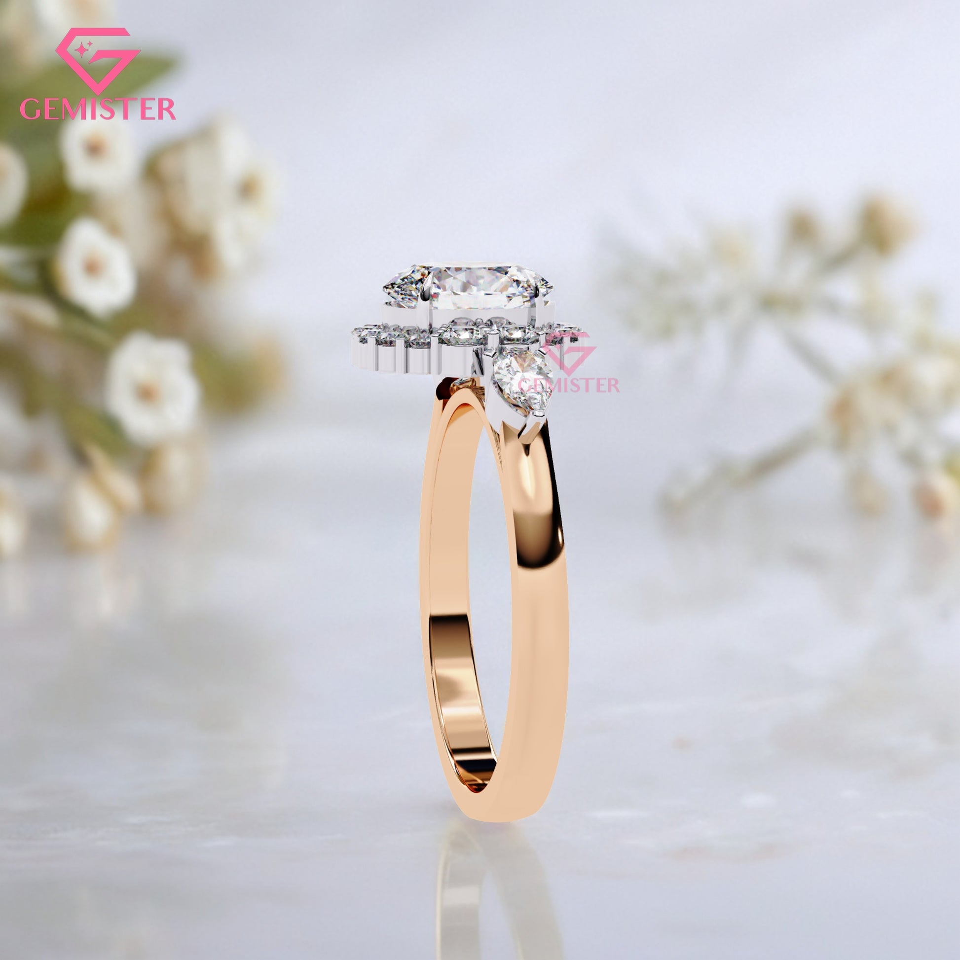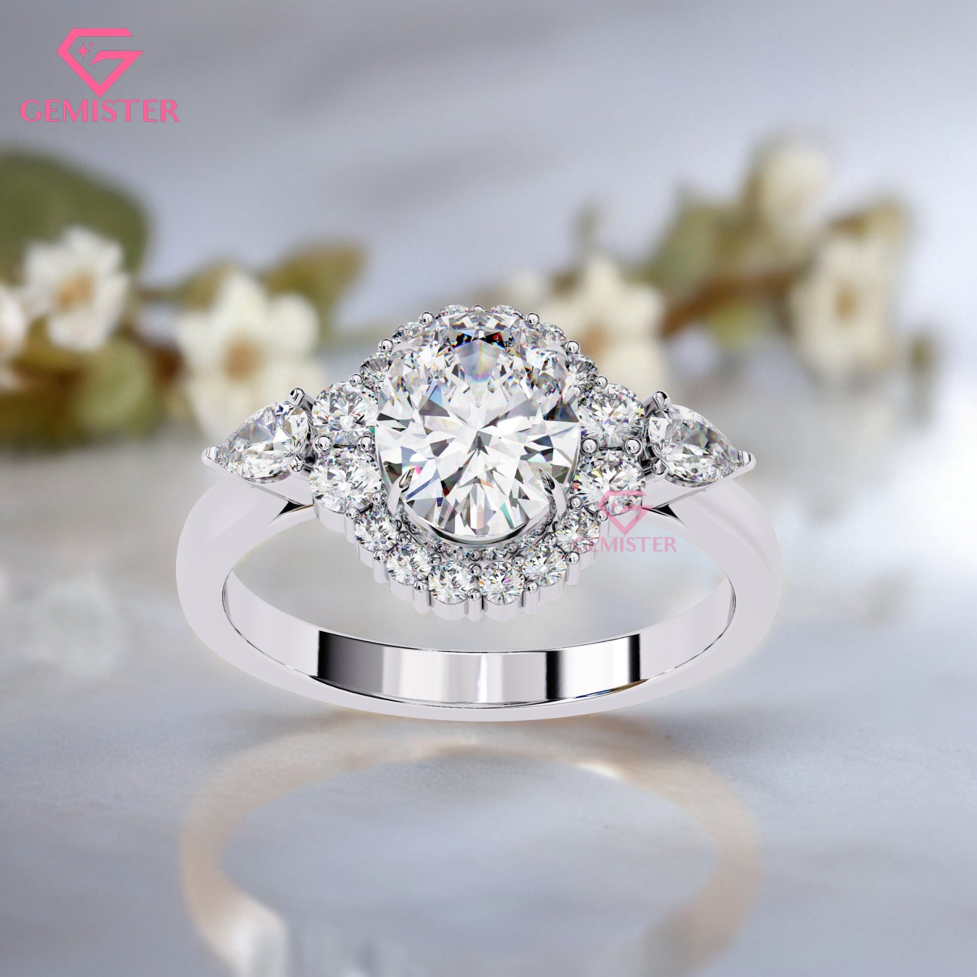 An oval moissanite ring is a symbol of everlasting brilliance and elegance. A halo engagement ring enhances the beauty of the center stone by surrounding it with a circle of shimmering moissanite accents. With the addition of pear-shaped side stones, this ring becomes a statement of uniqueness and romance, making it the perfect choice for your engagement.