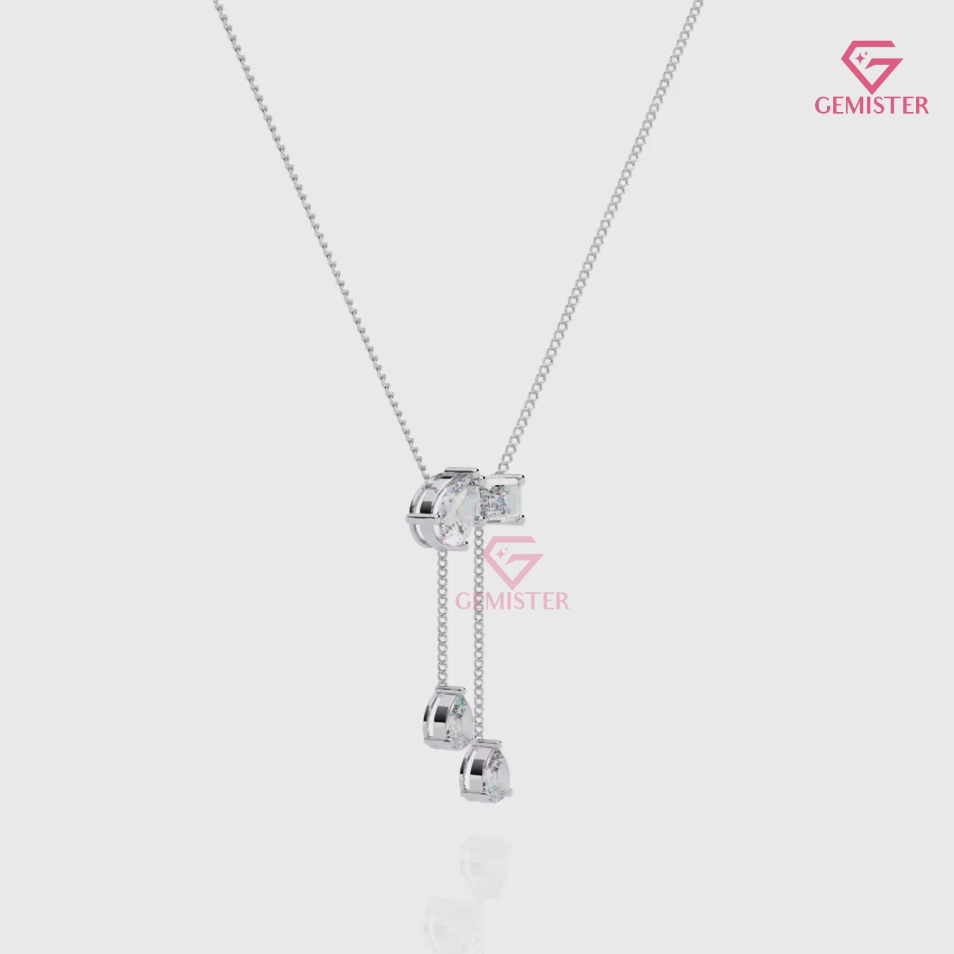 Elevate your style with this 1.59 CT Pear & Emerald Cut Moissanite Drop Necklace in 14K Yellow Gold. Crafted in a graceful lariat style, the necklace features a stunning blend of pear and emerald-cut moissanite stones that sparkle with the brilliance of diamonds.