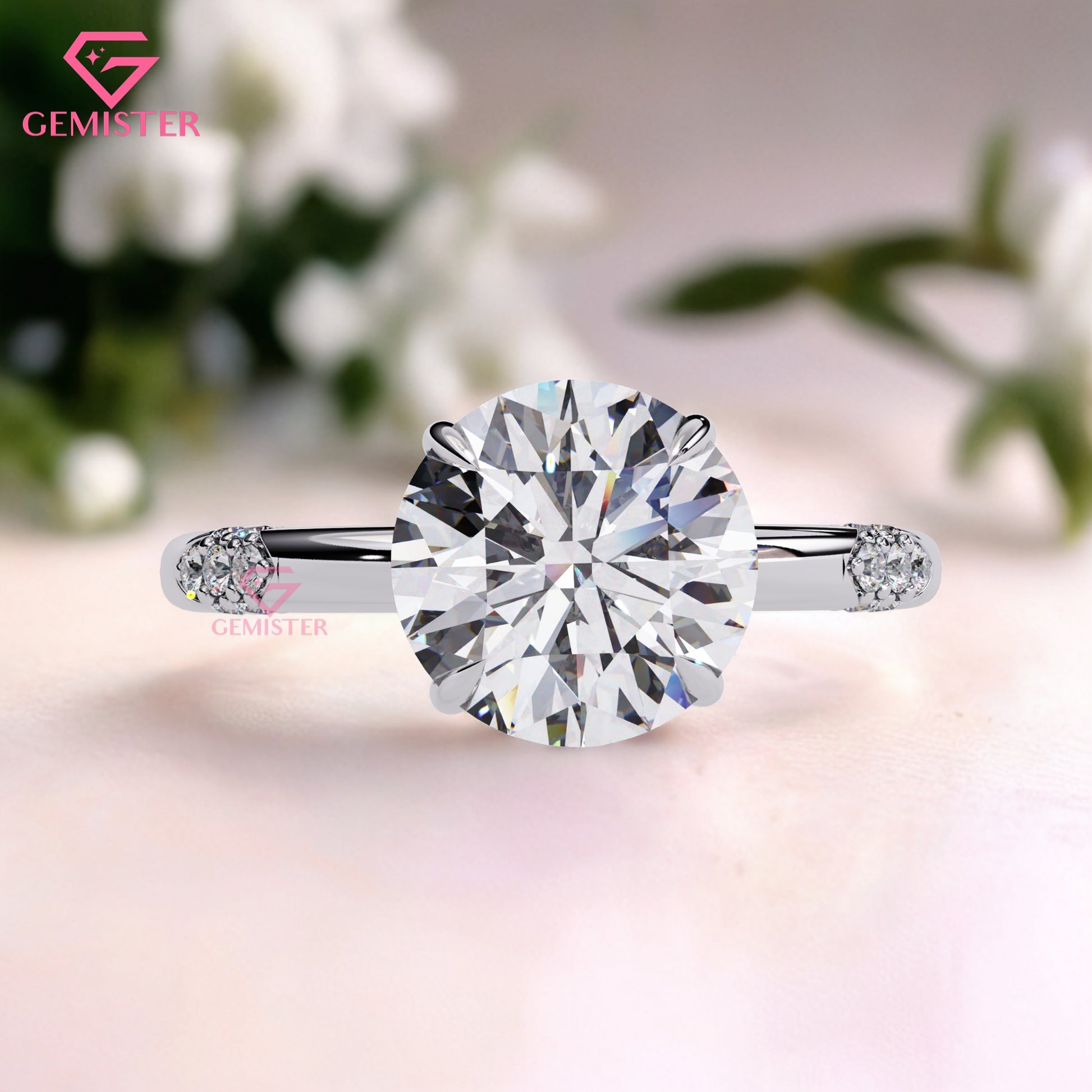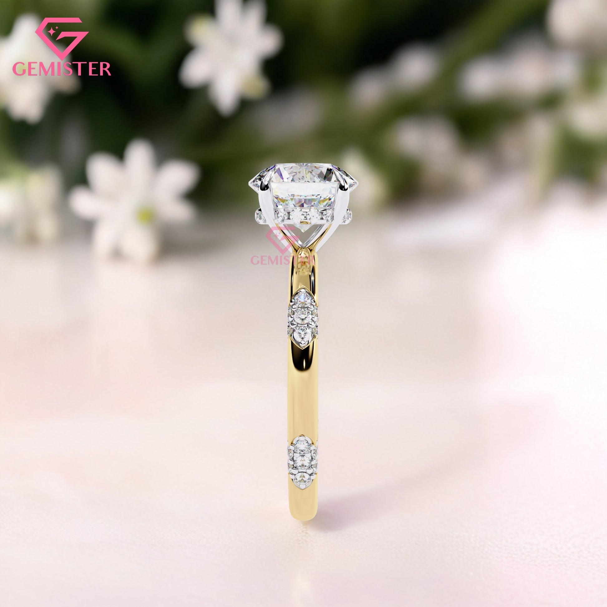 Celebrate your love with this breathtaking 2.85 Ct Round Cut Lab Grown Diamond Engagement Ring, a perfect balance of brilliance and timeless charm. The center moissanite dazzles with fire and sparkle, complemented by delicate side accent stones set in lustrous yellow gold. Designed for everyday wear yet luxurious in style, this ring makes an unforgettable choice for engagements, anniversaries, or milestone celebrations. Crafted with ethical and eco-friendly moissanite, it offers the beauty of a diamond at exceptional value. Whether as a promise ring or a statement of forever, this classic design is destined to be cherished for a lifetime.