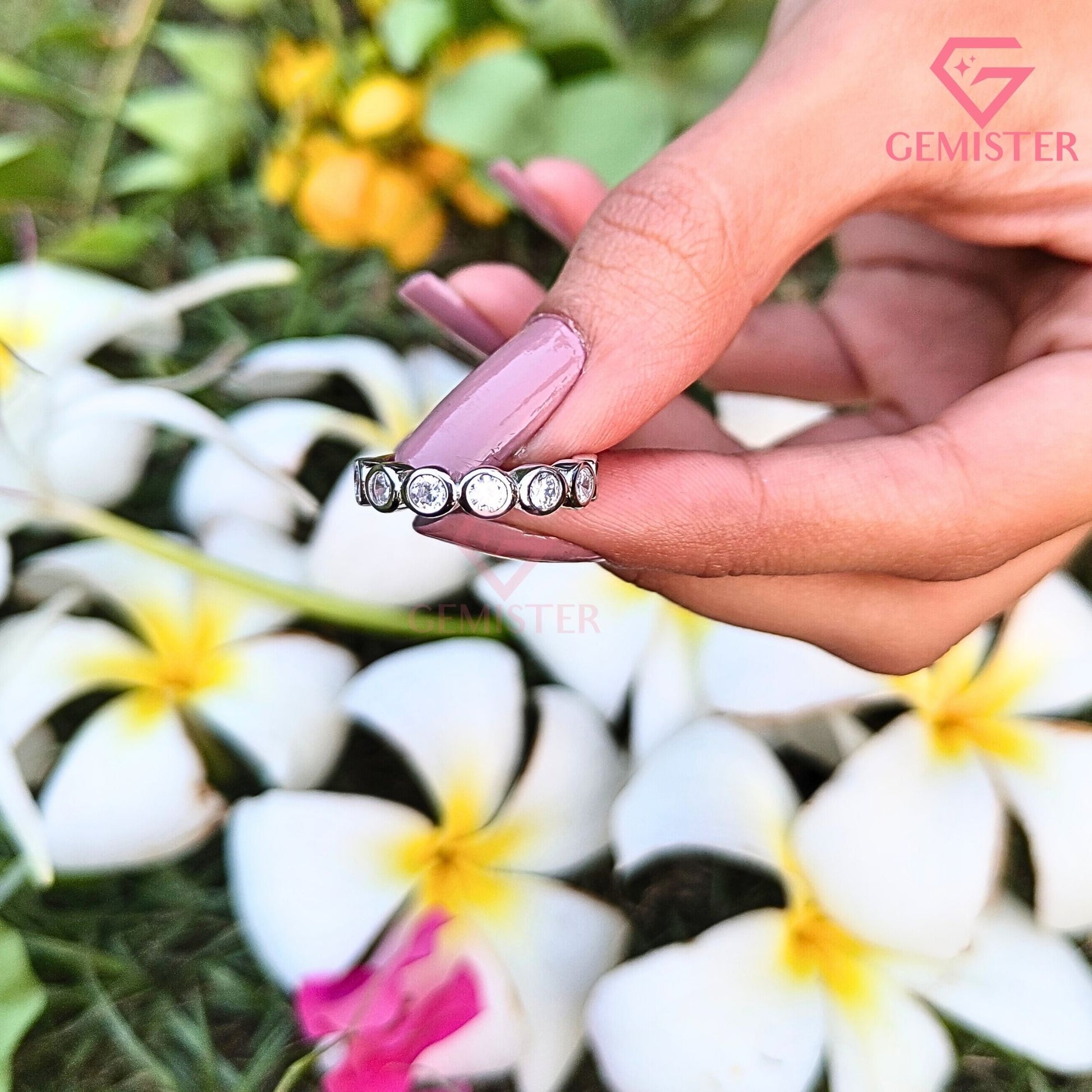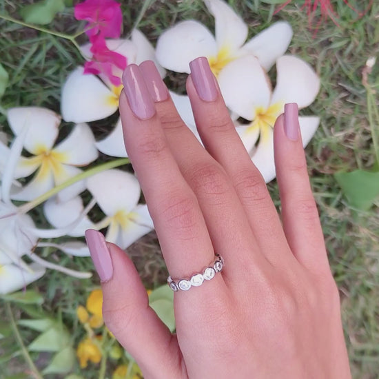 Embrace timeless simplicity with this round-cut bezel set half eternity band. Featuring a sleek "bubble" design that protects each stone, this minimalist ring is perfect for stacking or as a snag-free wedding band for everyday elegance.
