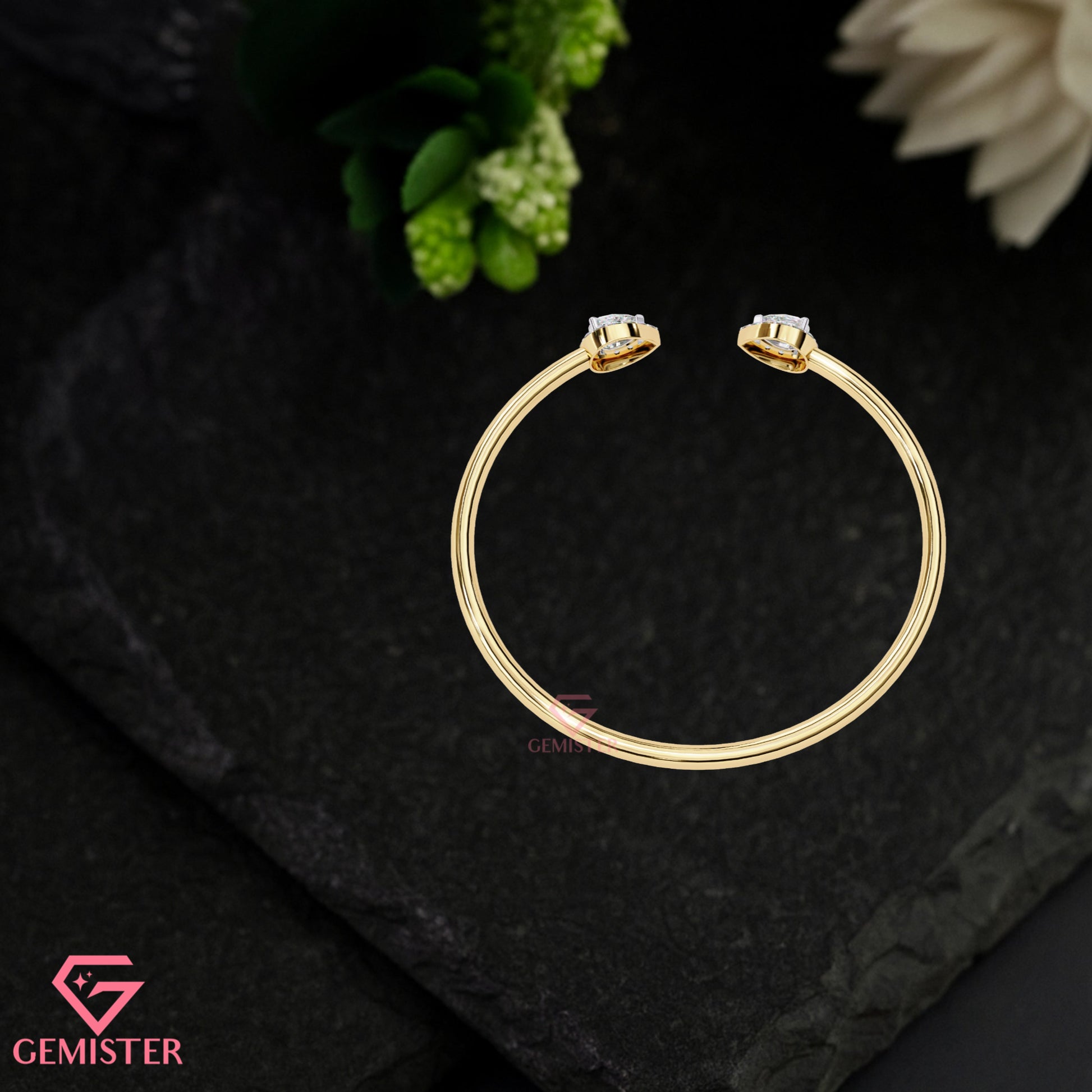 Elevate your style with our 1.17 CT Pear Cut Moissanite Open Bangle Bracelet in Gold, a modern classic designed for everyday elegance. Featuring two dazzling pear-cut moissanites set at each end of a sleek open bangle, this bracelet captures the perfect balance of sophistication and sparkle.